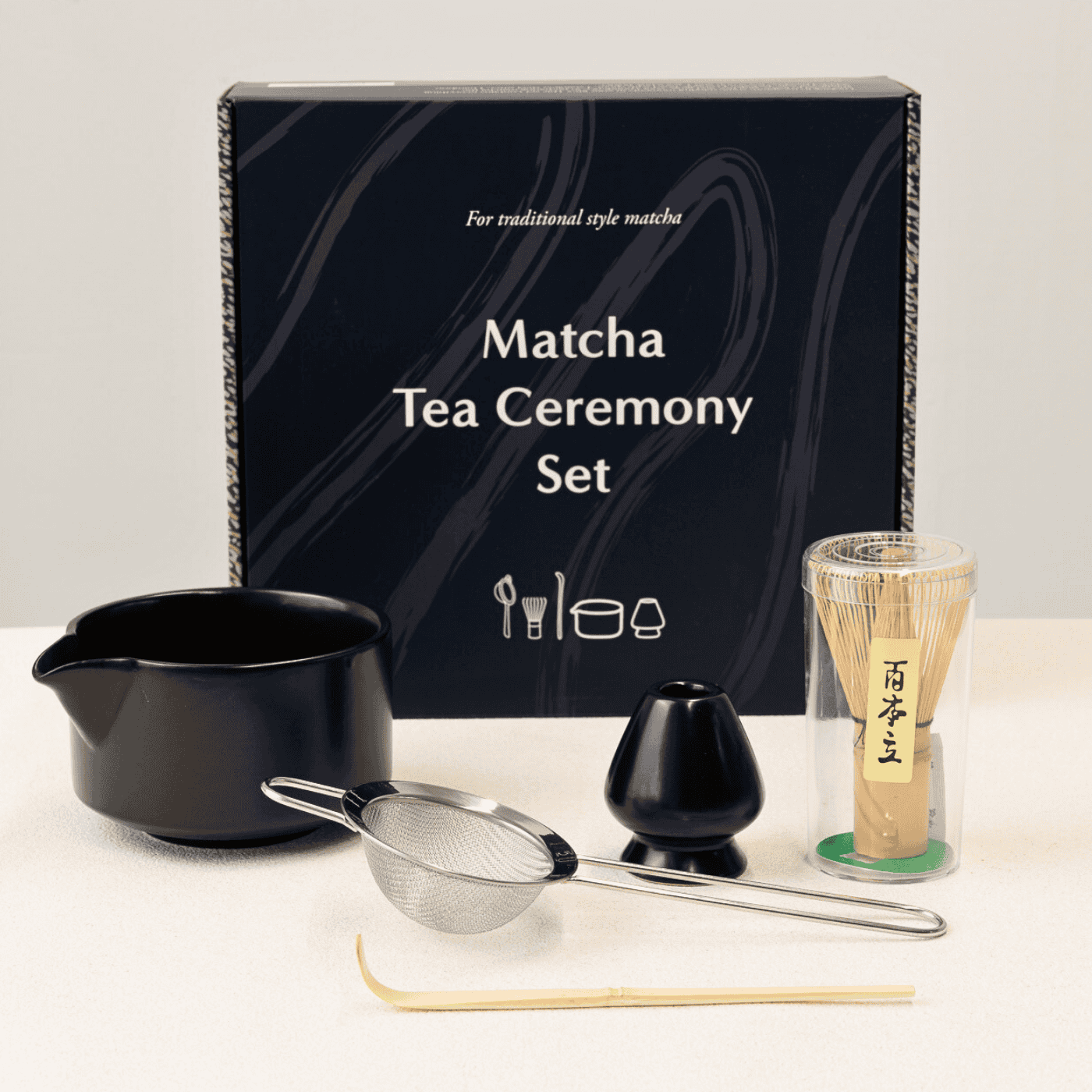 Includes all essentials for a refined matcha experience: 1 x bamboo whisk (chasen), 1 x matcha scoop (chashaku), 1 x sift, 1 x chawan bowl, and 1 x bamboo whisk holder.
